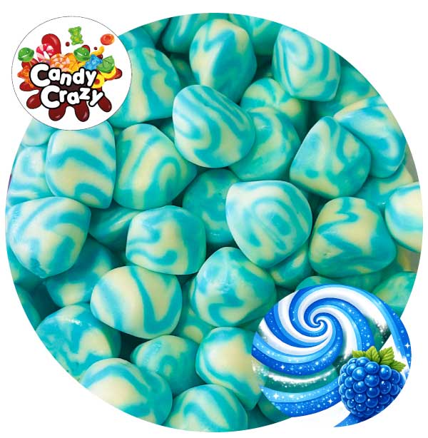 Caprices Twist framboise halal en vrac 100g. Bonbons spiralés blanc et bleu au goût fruité de framboise, parfaits pour un assortiment gourmand.
