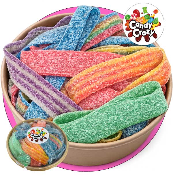Bowl gourmand de 350 g de ceintures acidulées aux saveurs variées : fruits, cola et arc-en-ciel… Texture souple, goût intense et effet qui pique.