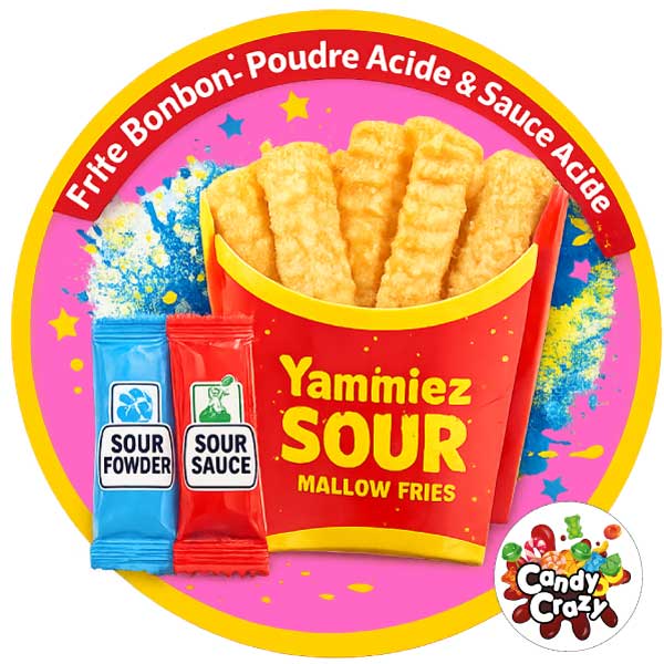 Découvrez les frites marshmallow acides Yammiez : de délicieuses frites en guimauve à tremper dans une sauce acide et une poudre acide. Un bonbon interactif original à savourer !